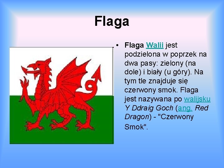 Na fladze walii jest czerwony smok (red dragon angielski, walijski y ddraig goch że ta legenda nawet odnosi się do miejsca, w walii i walii odzwierciedlenie w dość późno podbitego terytorium.